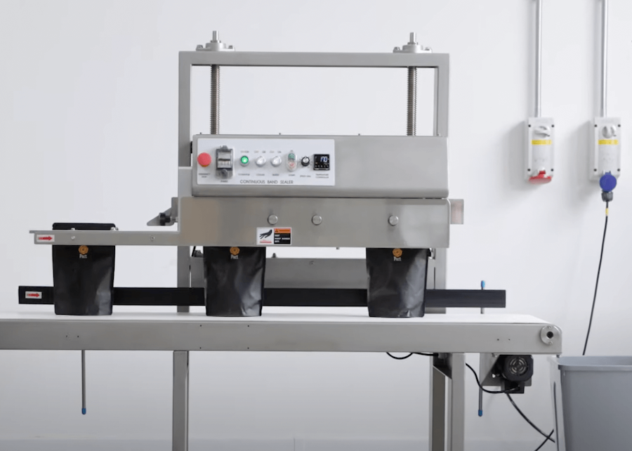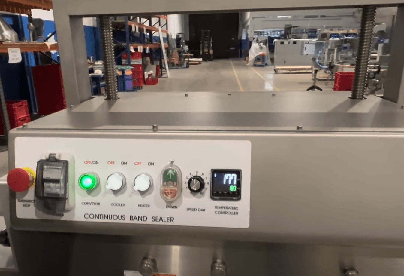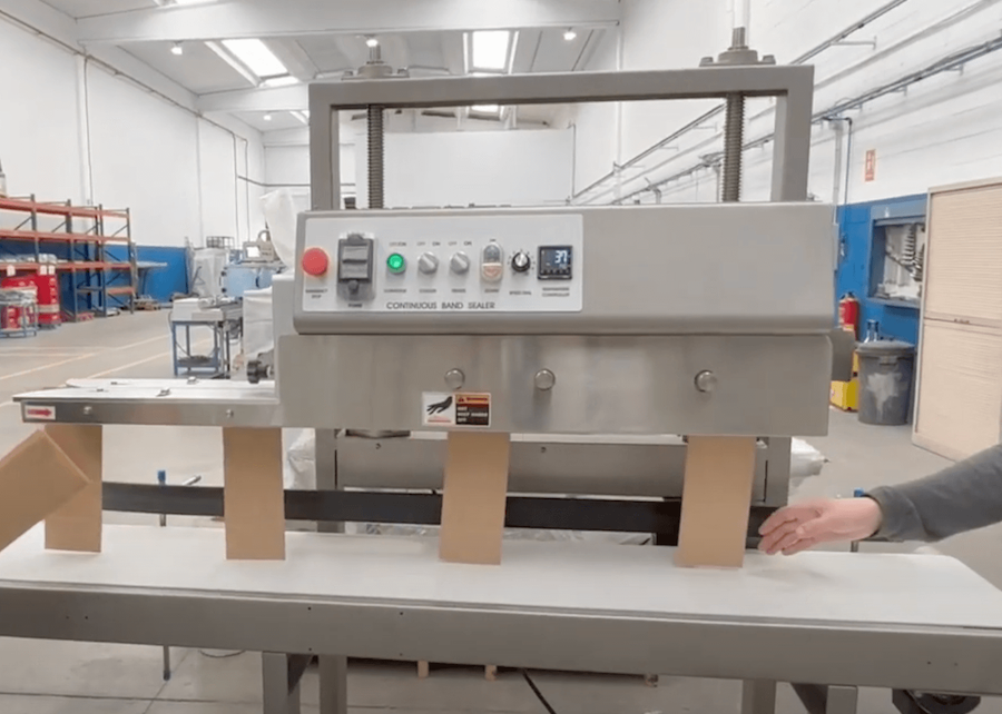 This is our standard model of heat-sealing machine. It is a vertical band sealer whereby the bag or doypack is fed into the band mechanism by an operator before being drawn through heat sealing jaws.