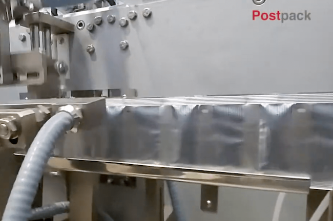 Heat-sealable film is drawn into the machine, a V-shape is formed and using intermittent motions, sachets are formed, filled, sealed and cut automatically.