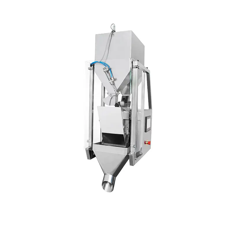 In semi-automatic models, when the target weight is reached an operator then presses a switch or a foot pedal to dispense the product whilst presenting the container or packet. In automatic models, the weigher would be synchronised to other packaging and processing machinery e.g. a VFFS machine, pouch, or sachet machine where the pack is automatically presented to the weigher, filled and moved away for further processing afterwards.